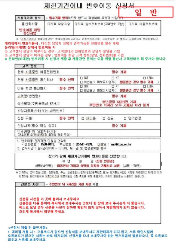이동전화 제한기간이내 번호이동 신청서 작성방법