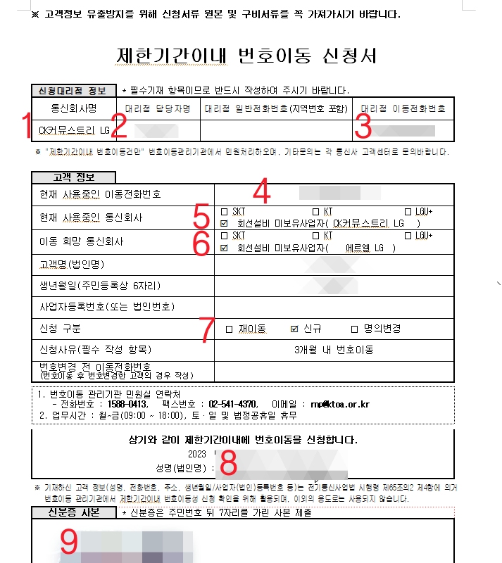 이동전화 제한기간이내 번호이동 신청서 작성방법