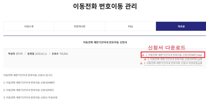 - 이동전화 제한기간이내 번호이동 신청서(hwp) 파일을 다운로드해 작성합니다.