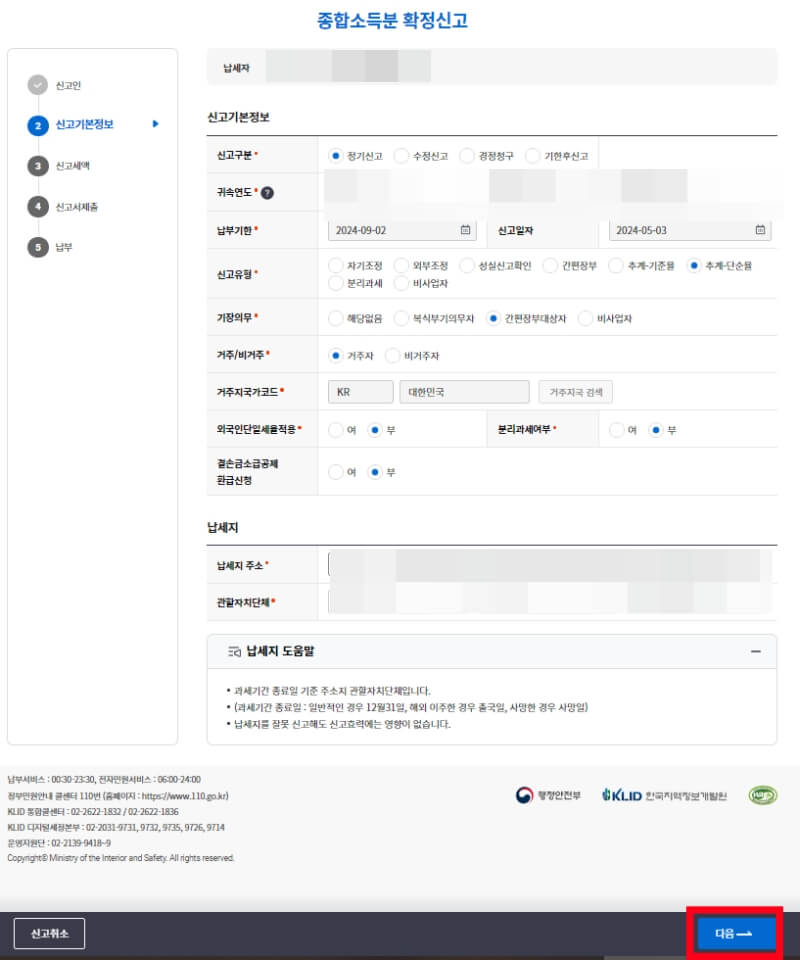 4. 납세자의 정보, 주소, 전화번호를 입력 후 '다음' 클릭합니다.