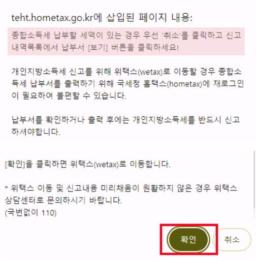 '신고 이동'을 누르면 배너가 뜨는데요. 위택스로 접속해 개인 지방 소득세를 신청하려면 로그인 과정이 번거로우니 꼭 종합소득세를 신청 후 홈택스에서 로그인하여 개인 지방 소득세 신청으로 넘어가는 것이 편리합니다.
