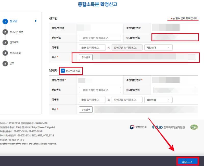 성명, 주민번호 확인 후 휴대번호, 주소, 신고자와 납세자가 동일하다면 '신고인과 동일'을 체크 후 '다음'을 클릭합니다.