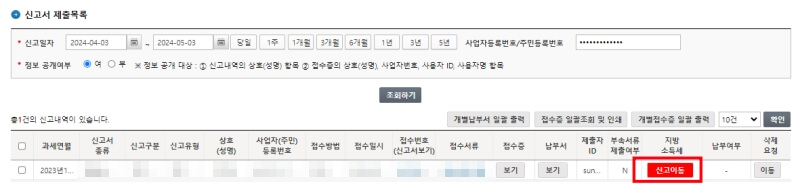 아래 사진처럼 종소세 신고 내역이 조회됩니다. '신고 이동' 클릭합니다.