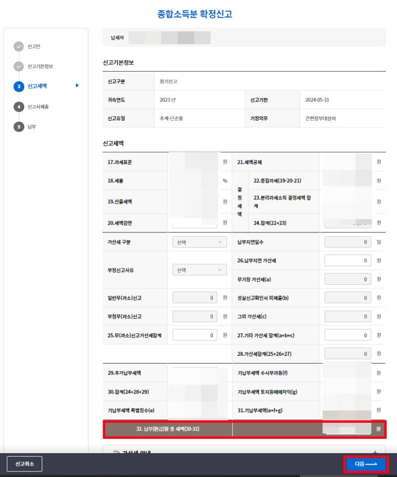 종합소득세 신고 금액이 정리되어 나옵니다. 하단의 32. 납부(환금) 금액 확인 후 '다음' 클릭합니다.