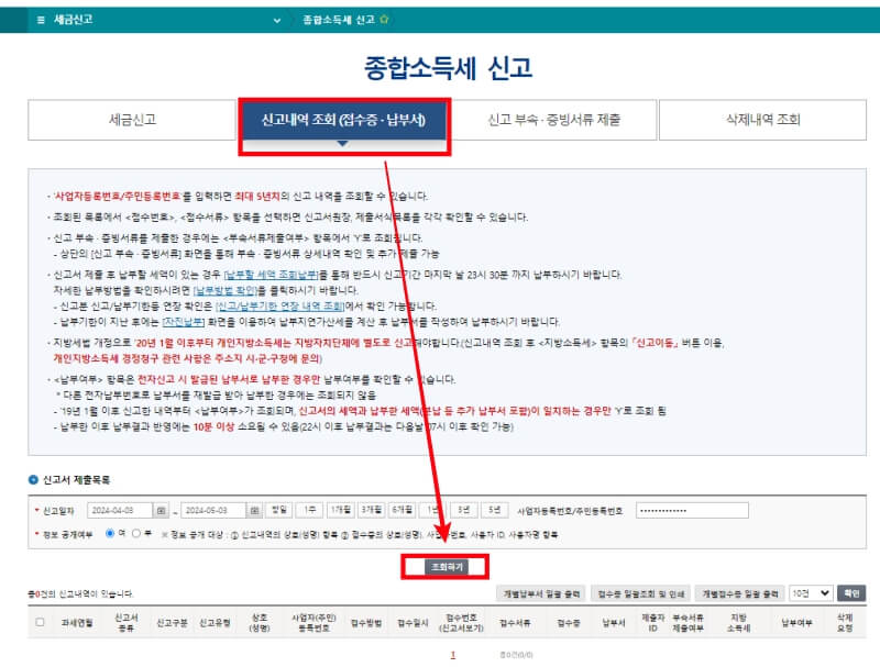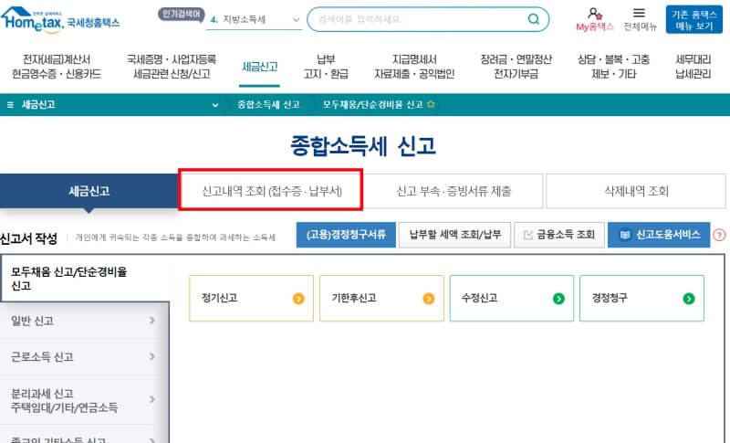 1. 홈택스 홈페이지에서 종합소득세를 신고 후 신고 내역 조회를 합니다.