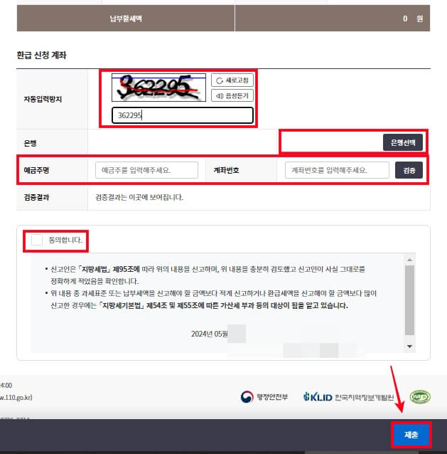 7. 자동 입력 방지, 환급받을 은행 선택, 예금주명, 계좌번호를 입력과 '동의합니다' 체크 후 '제출'을 클릭해 신청을 완료합니다.