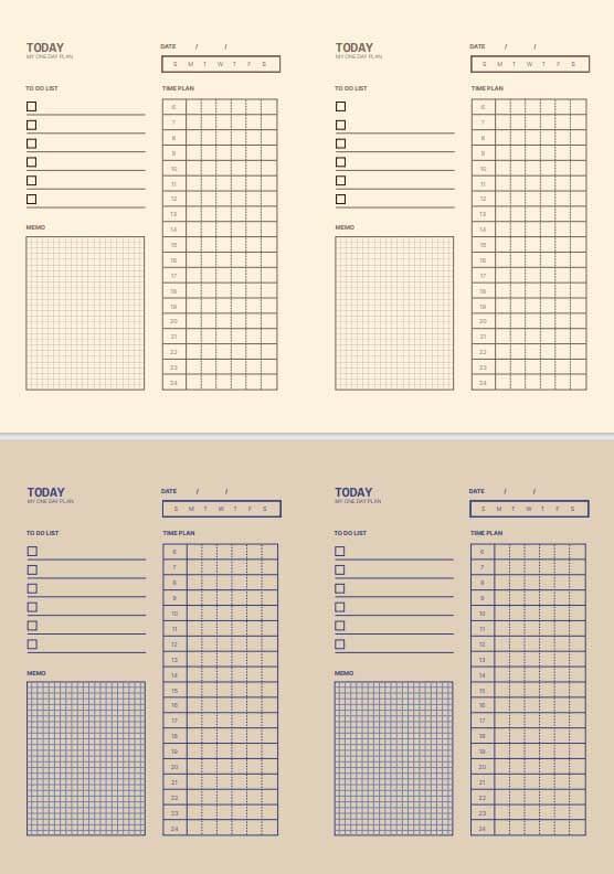 시간을 효율적으로 사용하기 위해 데일리 타임트래커를 만들어 봤습니다. 기존에 만들어 뒀던 양식을 조금 변경해 봤어요. 두 가지 사이즈 A4, B5로 만들고, 3가지 컬러로 제작했어요. B5 사이즈는