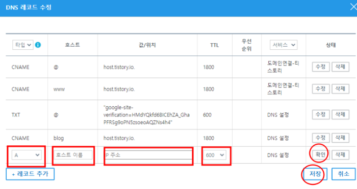 4. 레코드 수정으로 들어갑니다. 타입은 CNAME으로 설정하고 호스트 이름은 원하는 이름 넣어주세요. IP주소란에는 host.tistory.io. 를 입력합니다. TTL값은 1800으로 설정 후 확인 저장합니다. 레코드가 추가되었습니다. 가비아에서 설정은 끝났습니다.