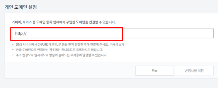 3. 조금 전에 가비아에서 만든 호스트 이름과 연결하여 도메인 주소를 입력하여 변경사항 저장합니다.