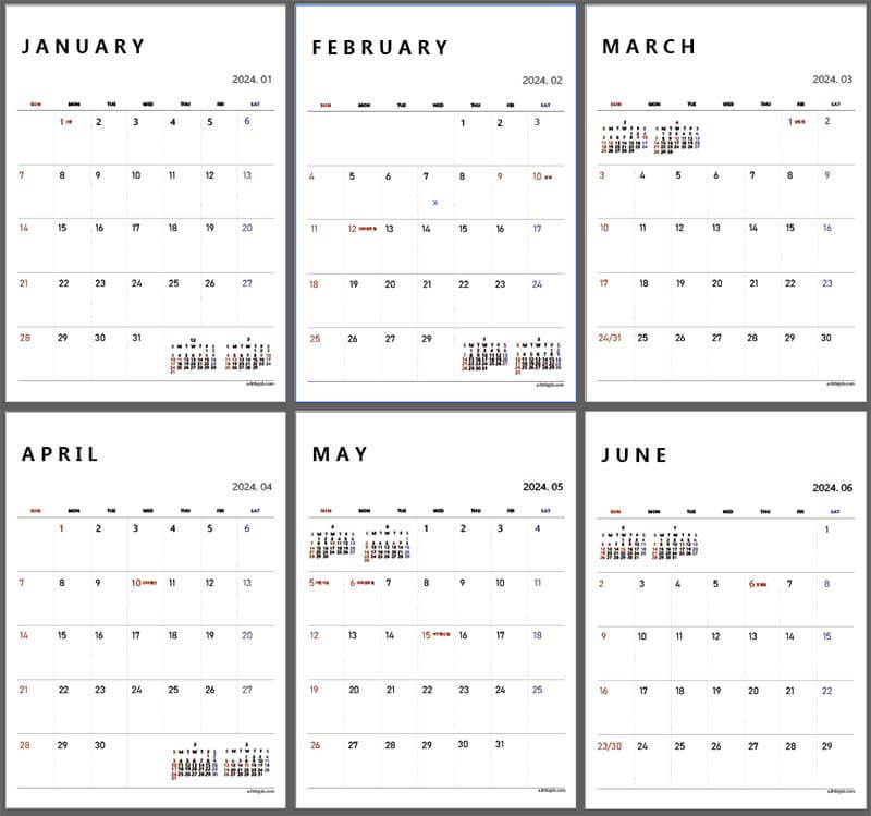 2024년 월달력을 제작해 보았습니다. 1월, 2월, 3월,4월, 5월, 6월까지 제작되어 파일 업로드 해두었습니다. 필요하신 분들은 다운로드해 사용하시면 되겠습니다. 2024년 월 달력 무료 다운로드 ● 다