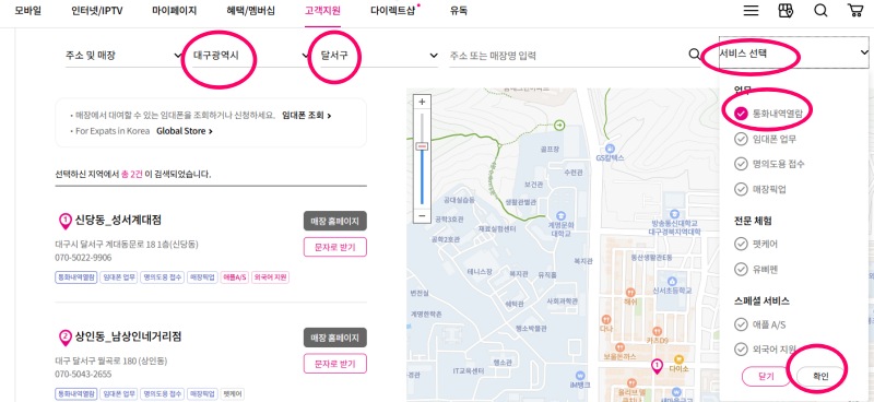 '대구' 입력, '달서구' 선택 후 '서비스 선택'에서 '통화내역 열람' 체크 후 확인 누르면 직영점이 검색됩니다.