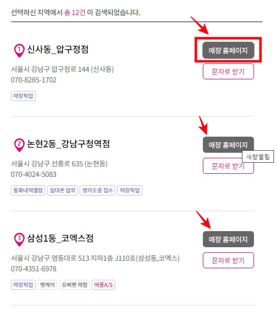 매장명을 확인하시고 가까운 매장 홈페이지로 클릭하여 확인합니다.