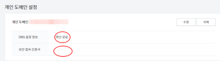 4. 변경사항을 저장하면 DNS 설정 정보에 '확인 완료'로 나옵니다. 보안 접속 인증서는 시간이 지나면 '발급 완료'로 나타납니다. 최종적으로 새 블로그와 도메인이 연결되었습니다.