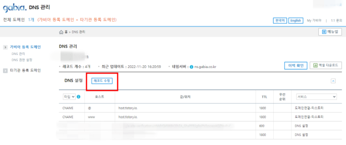 3. DNS 설정을 클릭합니다. 레코드 수정으로 들어갑니다.